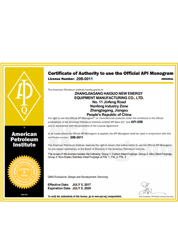 公司取得了美國ABS、法國BV、中國CCS、挪威DNVGL、韓國KR、英國LR、日本NK、意大利RINA等全球八大船級社的工廠認證證書,建立了完善的產品質量管理體系。先后獲得了美國API20B資質證書、API6A資質證書、APIQ1體系證書、TPG的NDT認證證書、TPG 熱處理認證證書、歐盟PED等認證證書,同時也通過了一些國際客戶具有高度專業要求的資格認證。